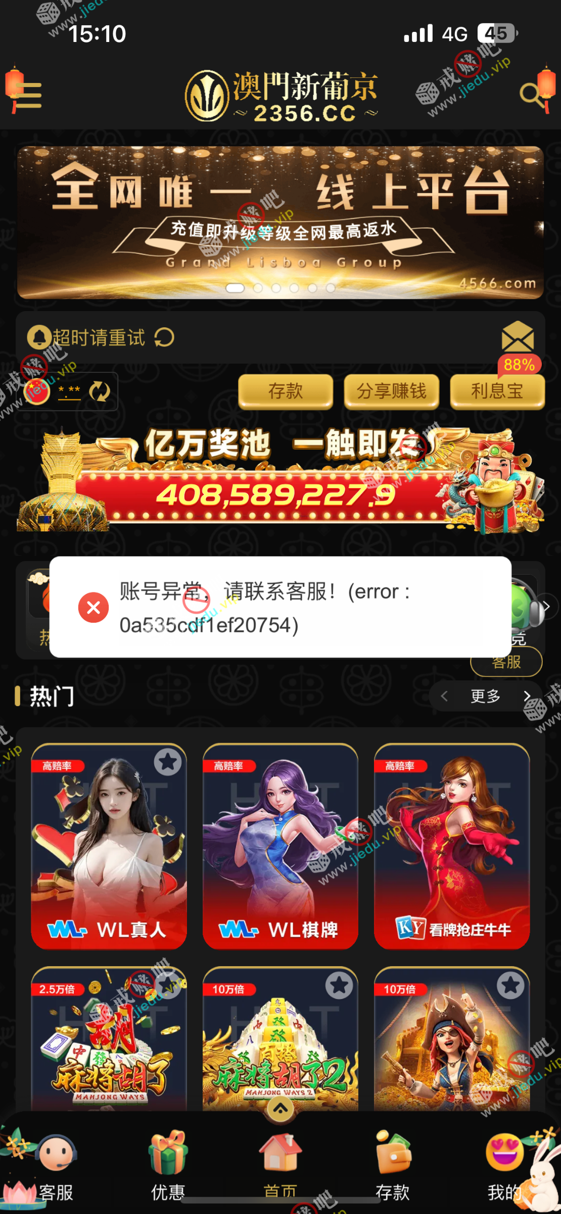 澳门新葡京2356A黑平台,领了几块钱彩金提了50块直接冻结账号。活不起了这平台