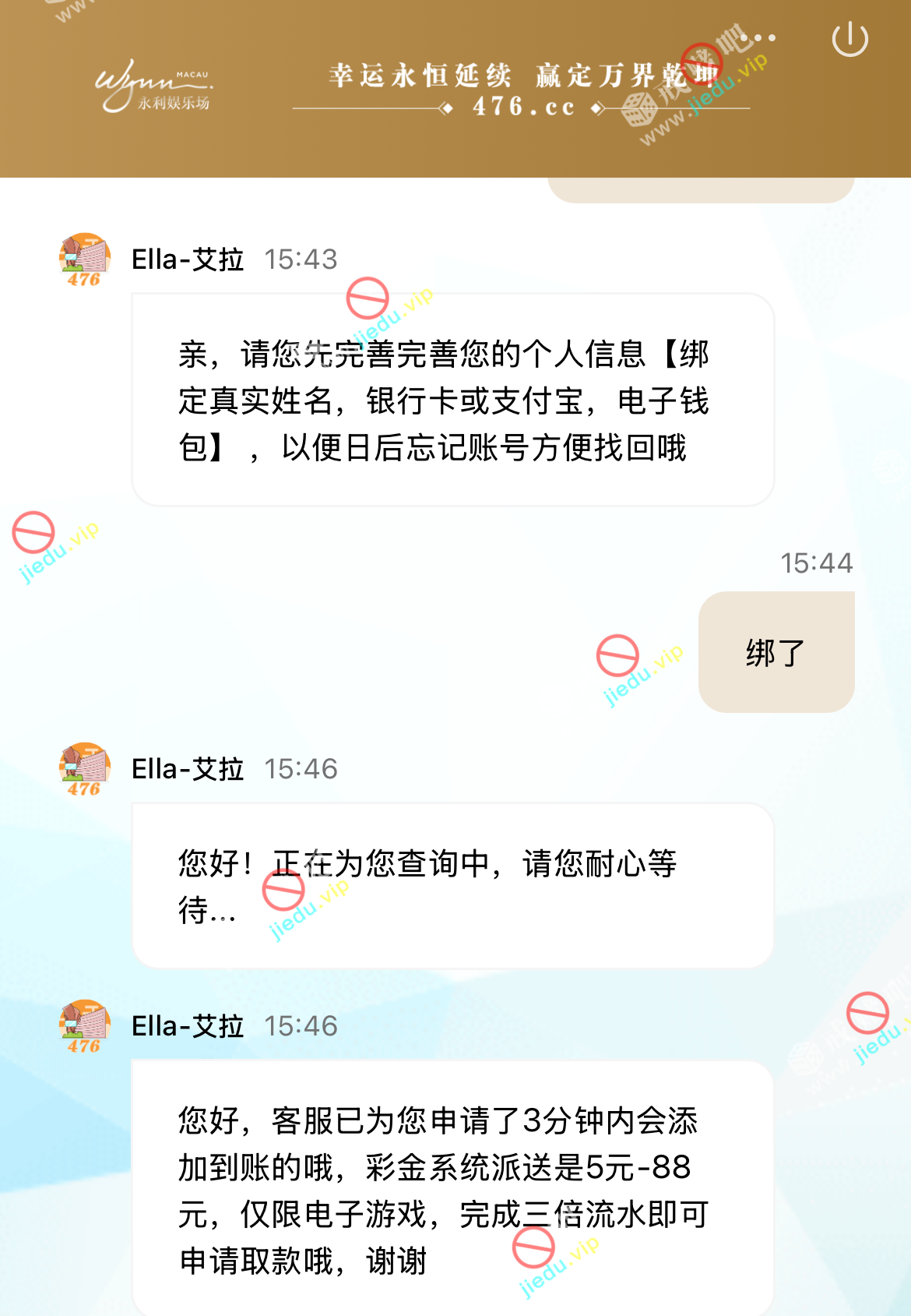 找客服说接到电话,领取电话彩金,客服让你绑定信息,待会就 5 - 88 元的随机彩金到了。