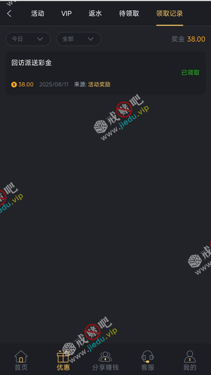 打电话回访彩金,自己去登录看看,我领到了 38,白嫖 200。